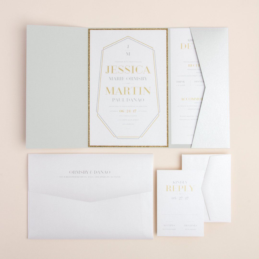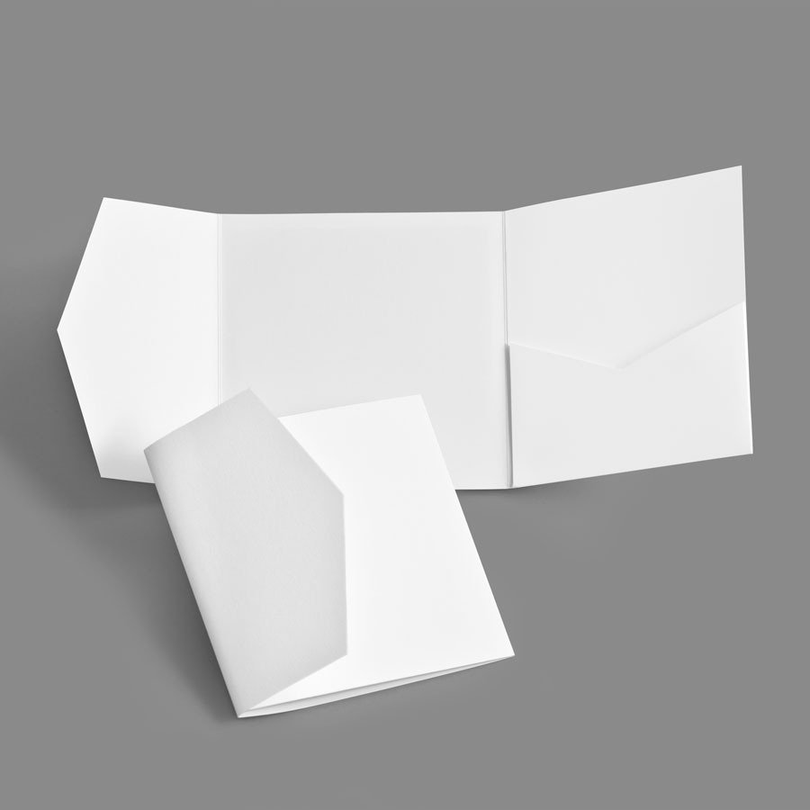- The Pocket Fold is een kaart in de vorm van een drieluik (vierkant of rechthoekig). Wanneer men de kaart open vouwt, bevindt zich een mapje waarin verschillende kaartjes worden geschoven. Op het middenpaneel wordt de 'hoofdkaart' (uitnodiging) geplakt (met al dan niet een contrasterende kleurlaag eronder). In het mapje worden veelal 3 x kaartjes met programma, informatie over het huwelijk, RSVP, dresscode en andere praktische informatie vermeld.